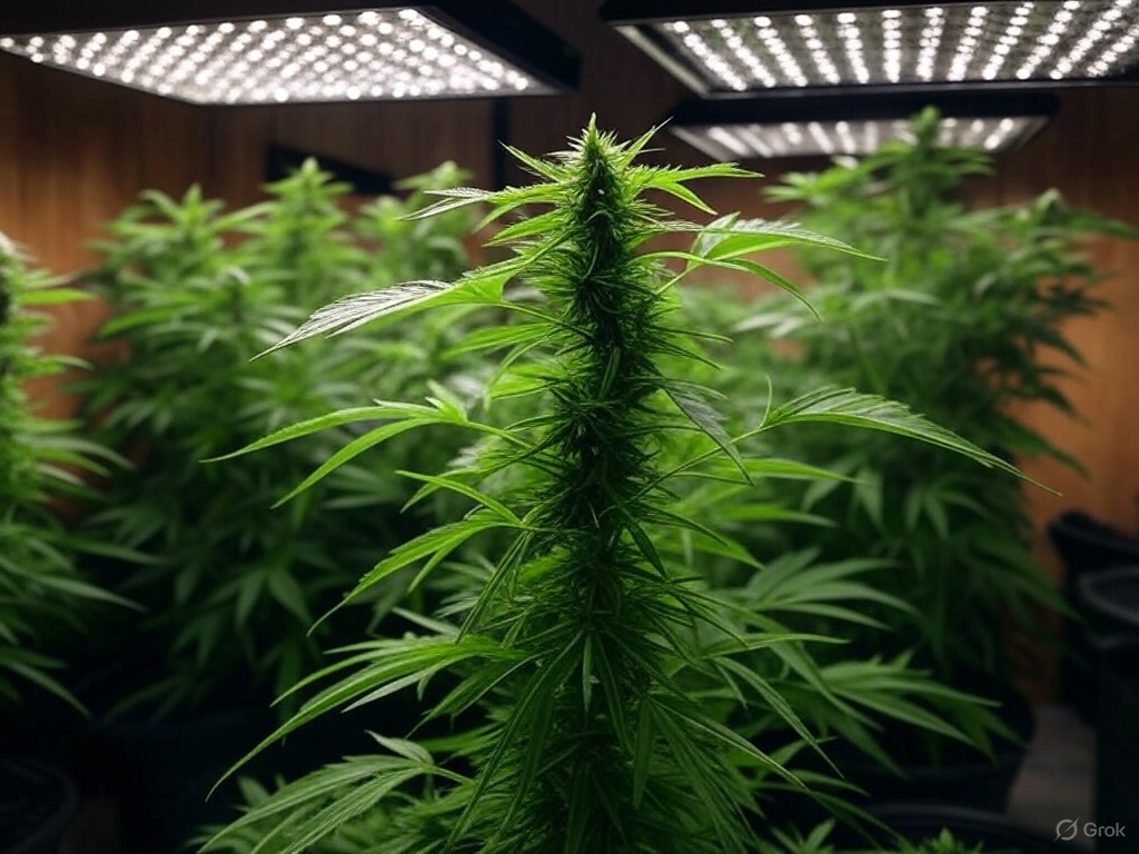The plant’s canopy is even, with dense, trichome-covered buds that sparkle under the LED lights, a sign of a healthy grow.
